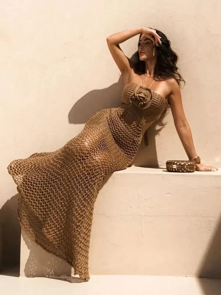 The garment has a unique hollow-out design that is painstakingly crocheted to give it texture and depth. It exudes a creative and romantic vibe. enhanced by the 3D floral design scattered throughout. and a halter neckline that perfectly showcases the shoulders.