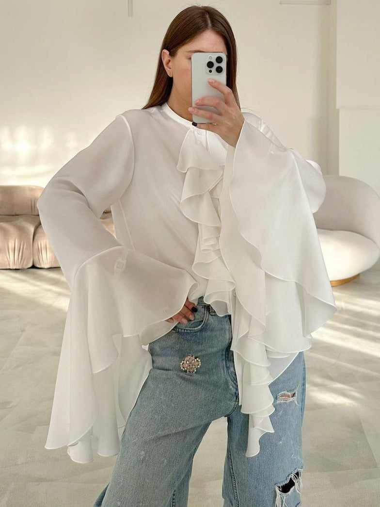 Experience ethereal beauty with this vintage designer ruffled blouse. Featuring a round neck and flouncy detailing along the button-down front, this crisp flouncy top exudes timeless elegance. The ruffled-edge long sleeves add a touch of romance, while the semi-sheer chiffon fabric ensures breathability and a refreshing feel. Pair it with skinny jeans for an effortlessly chic off-duty look or with a pencil skirt for a polished office ensemble. This elegant ruffled shirt radiates a captivating sophistication.