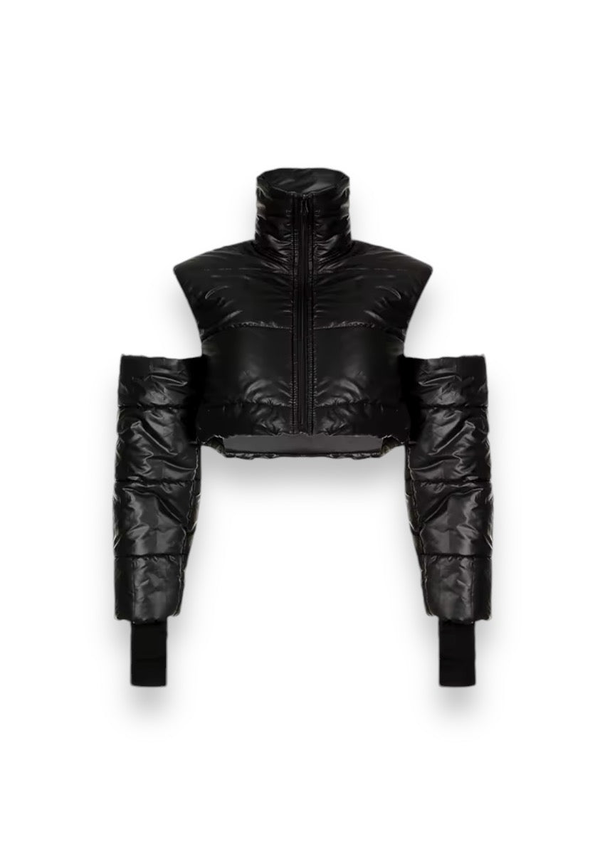 This cropped puffer jacket is both functional and fashionable. offering warmth while maintaining a modern streetwear aesthetic. Its bold design makes it a versatile layer for urban looks. while the high collar adds a dramatic touch. Perfect for cool days when you want to make a statement. this jacket is a must-have for trendsetters.