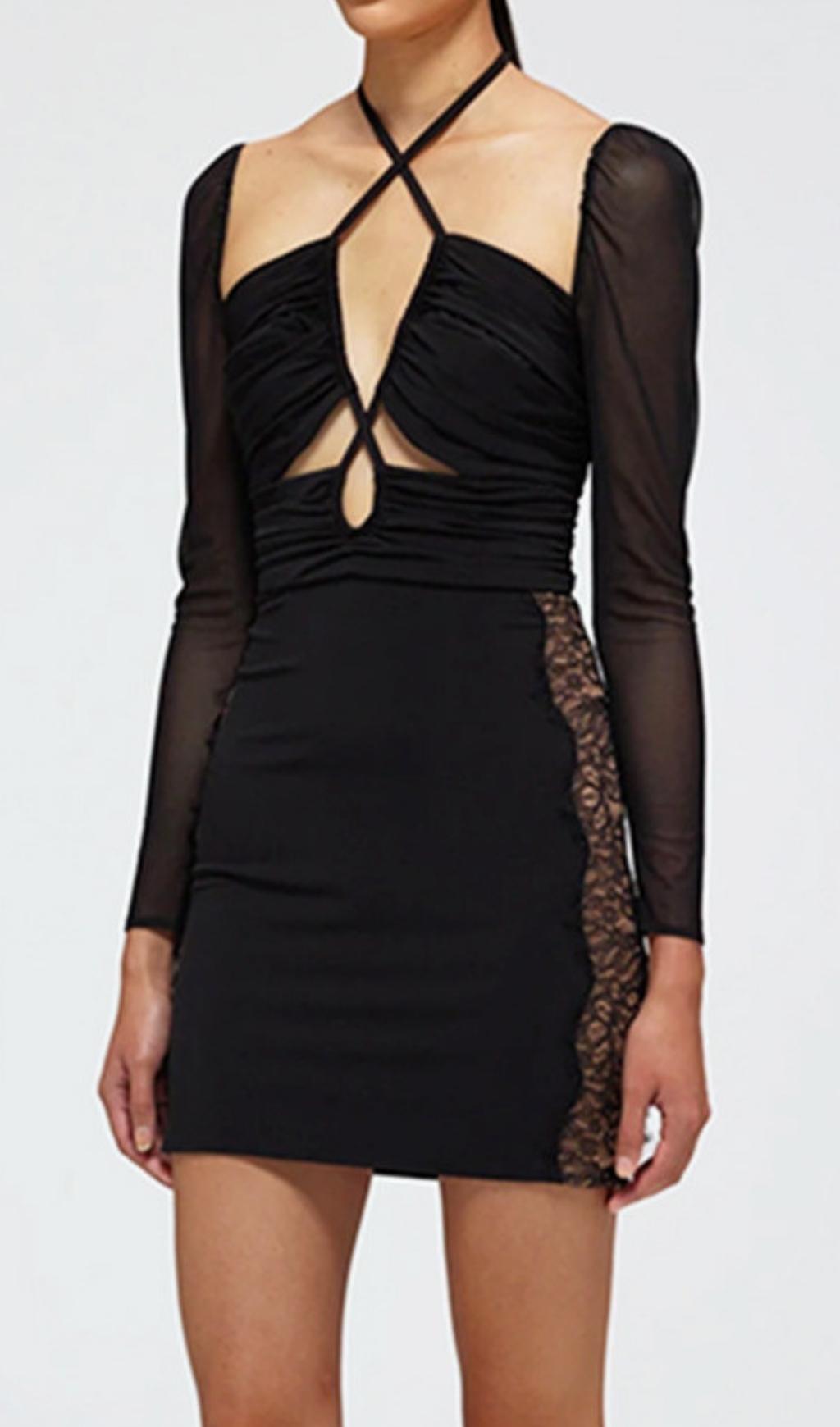 Black Halter Long Sleeve Mesh Lace UP Mini Dress