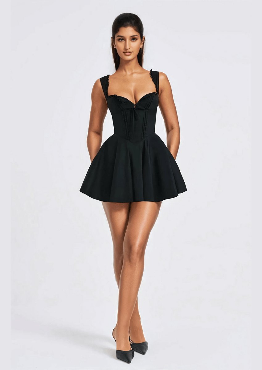 This black lace-trim mini dress combines the sophistication of corset styling with a playful. flared skirt. creating a look that's both bold and feminine. Featuring a sweetheart neckline adorned with delicate lace trim and a dainty bow. this dress exudes romantic charm. The structured bodice enhances your shape. while the fit-and-flare design ensures comfort and movement. Perfect for date nights. parties. or any occasion where you want to make a statement. this dress is as versatile as it is stylish.