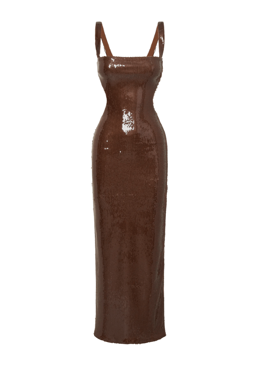 Turn heads with our Brown Maxi Dress a captivating blend of sleek style and sparkling allure. Crafted from a dark. metallic brown sequined fabric. this sleeveless. form-fitting masterpiece hugs your curves while its stylish side cut-outs add a contemporary edge. Designed for those who love to dazzle. it's your perfect companion for gala nights. parties. or formal dinners.