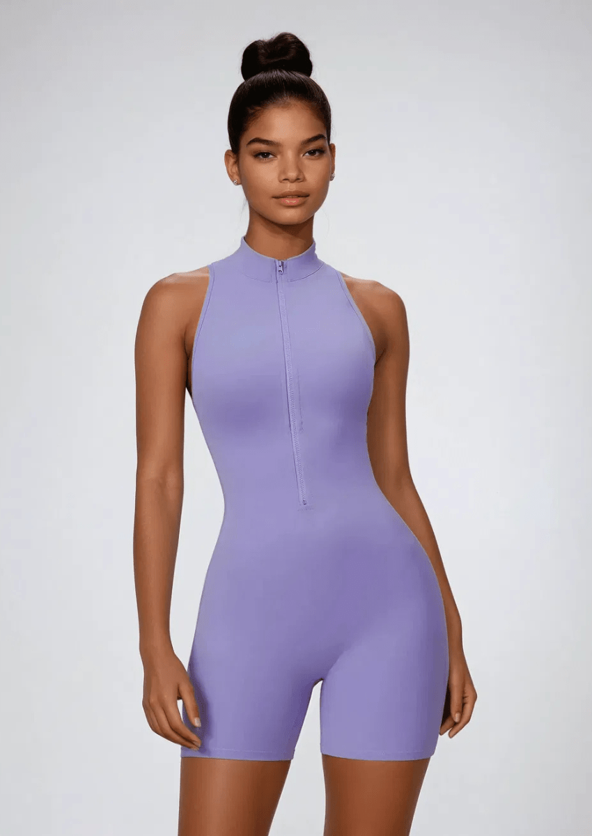 The Bubble Romper stands out with its high neckline and front zipper closure. creating a polished yet functional look. Its daring cutout back design adds a touch of boldness. while the body-contouring fabric provides a flattering fit for every curve.