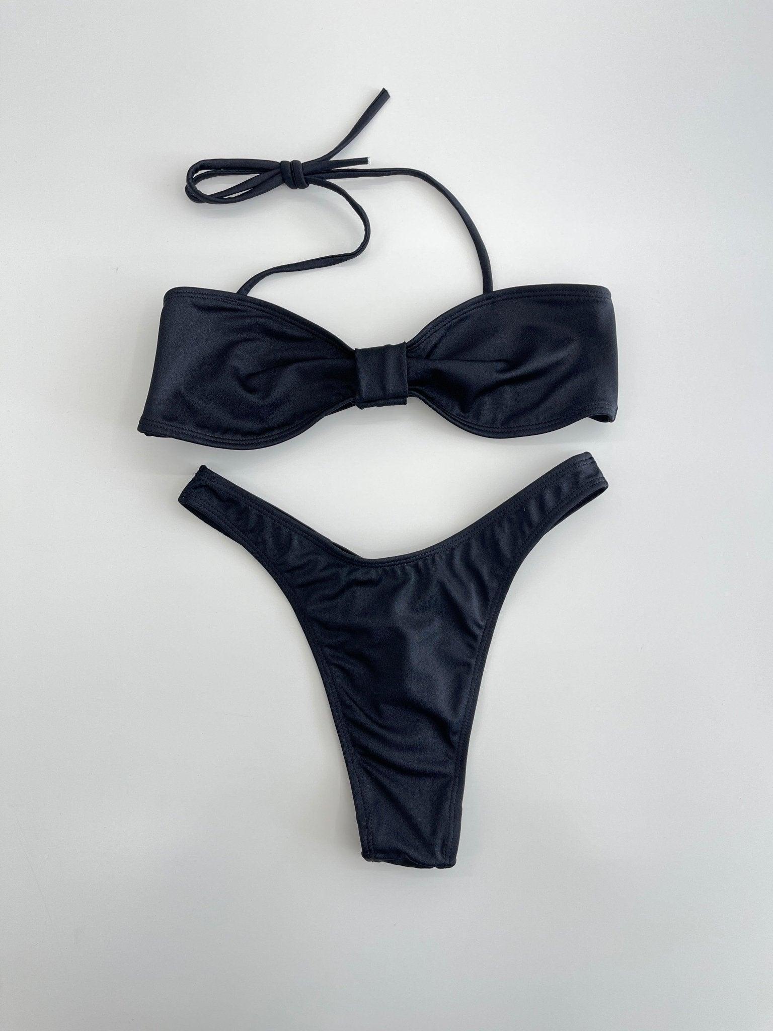 The Cece in Black by Mabel Love Swim is a classic bandeau bikini featuring adjustable tie neck. Thong Bottom