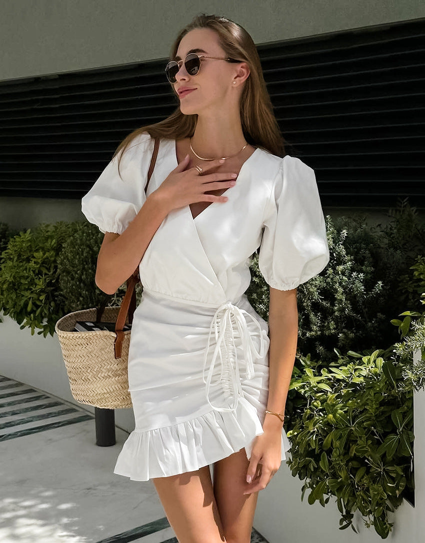 Step into summer elegance with the Cotton Pleated Mini Dress. This dress showcases delicate pleats, perfect for chic summer outings. The puff sleeves and square neckline add a timeless touch. Crafted from breathable cotton, it ensures comfort and style. The fitted bodice and flared skirt create a flattering silhouette. Whether you're attending a garden party or a casual brunch, this dress will make you stand out. Embrace sophistication and effortless charm in this stunning piece. Enhance your wardrobe with this must-have Cotton Pleated Mini Dress today!