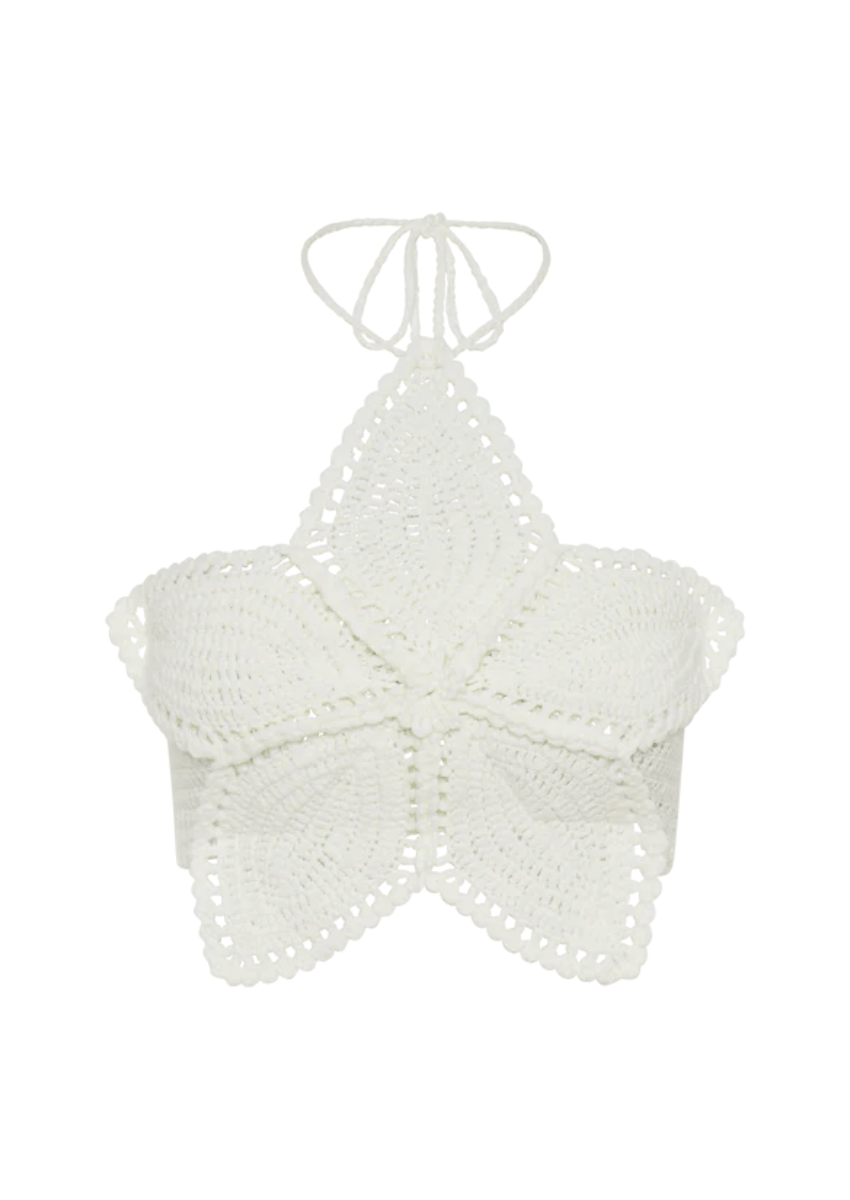 A crochet flower halter top with a unique. intricate design resembling a butterfly or floral pattern. It features a handcrafted. woven style that gives it a bohemian and summer-inspired look.