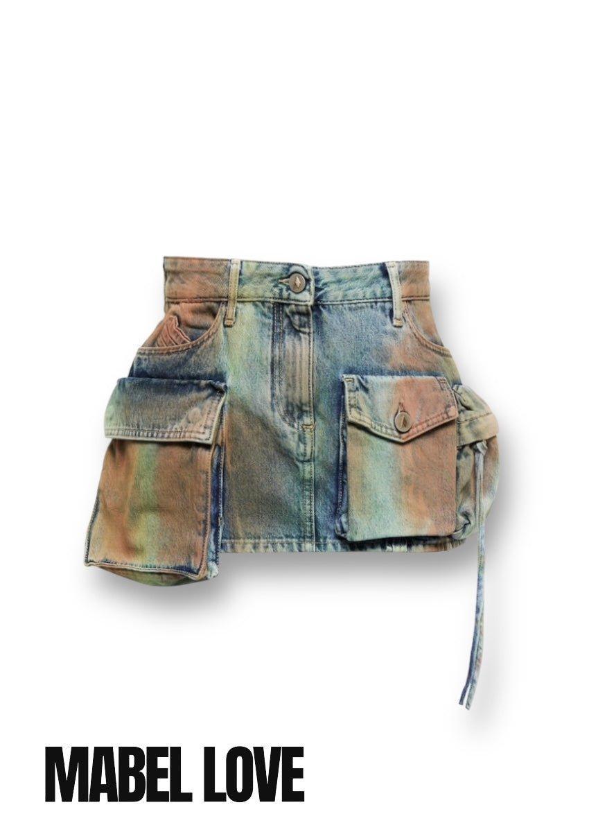 Denim cargo skirt Its cargo pockets offer ample storage space while adding a unique touch to the design. With its stained finish. this skirt is both trendy and versatile.