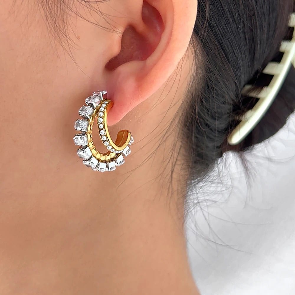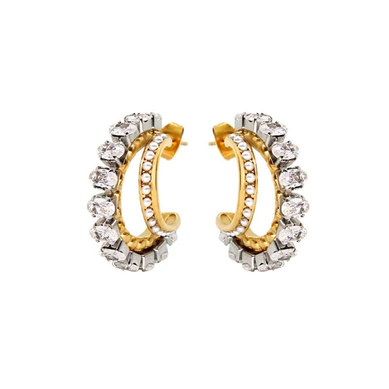 Elevate your accessory game with these Double Hoop Earrings that blend timeless elegance with a contemporary flair. Featuring a dazzling combination of gold and silver tones. these earrings are designed to make heads turn. The delicate cubic zirconia stones. set along both the outer and inner edges. bring a touch of refined sparkle that is perfect for any occasion. Whether you're dressing for a formal gala. a romantic dinner. or simply want to add a statement piece to your everyday look. these earrings are the ultimate choice.