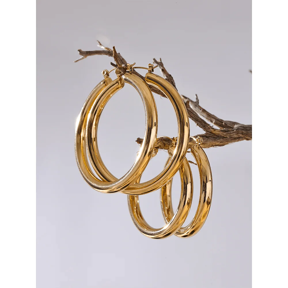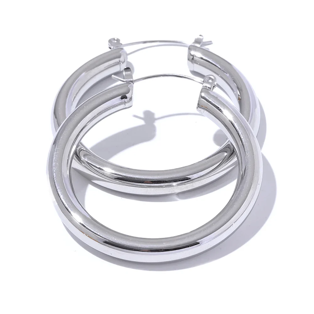 Classic. sleek. and effortlessly stylishhe Esmeralda Hoop Earrings are the perfect finishing touch to any outfit. Designed for versatility. these stainless steel hoop earrings come in both gold and silver finishes. making them a must-have for every jewelry collection. With their smooth. polished surface and secure clasp mechanism. they offer a sophisticated yet comfortable fit for all-day wear. Whether you're dressing up for a night out or keeping it chic and minimal for everyday elegance. these hoops will never go out of style!