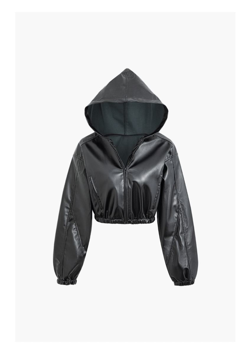 Introducing our Women's Faux Leather Crop Jacket. a trendy addition to your autumn and winter wardrobe. This hipster-inspired jacket features a hood and long sleeves. offering both style and functionality. The faux leather material provides a chic. edgy look. while the cropped design adds a modern twist. Perfect for casual. streetwear. and wild hipster trends. this zip-up coat is a must-have for fashion-forward individuals.