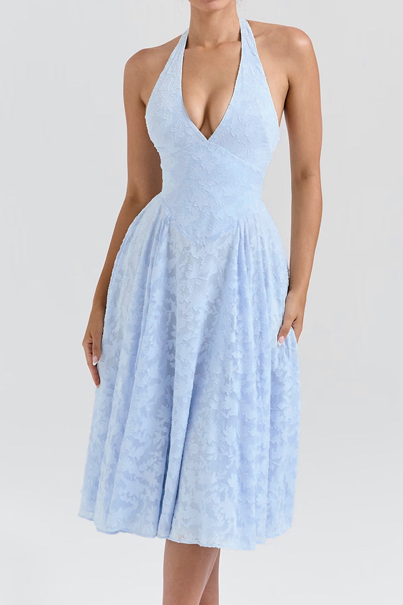 Elegant and romantic, our midi dress is a must-have for your special events. Made from a bluebell floral jacquard, has a flattering halter silhouette with a perfectly boned bodice to cinch the waist. The plunge halter neckline turns to showcase the open back and the floaty skirt offers a romantic feel.It zips to the back for easy on.