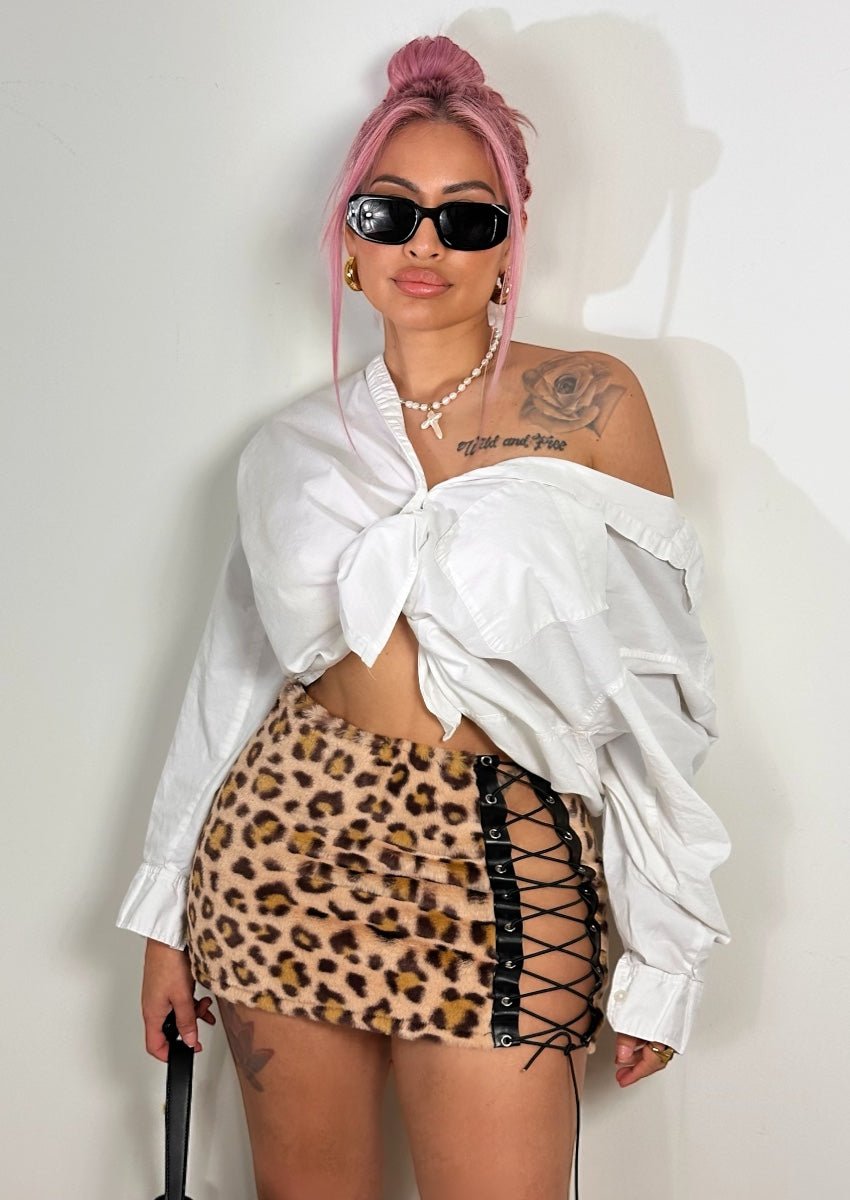 Unleash your wild side with the Fuzzy Leopard Lace-Up Mini Skirt. a daring piece that's perfect for standing out in any crowd. This mini skirt is a statement of bold fashion. featuring a striking leopard print. edgy lace-up detailing. and a cozy fuzzy texture. Whether you're hitting the town or elevating your casual chic. this skirt is your go-to for turning heads.