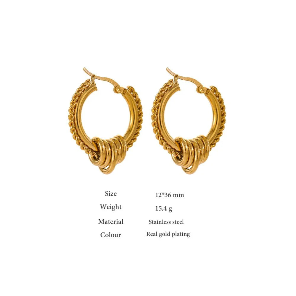 "These earrings are stunning! The twisted rope detail and the clustered rings at the bottom add such a unique touch. I've worn them to parties and even to work they're so versatile!" Sarah T.