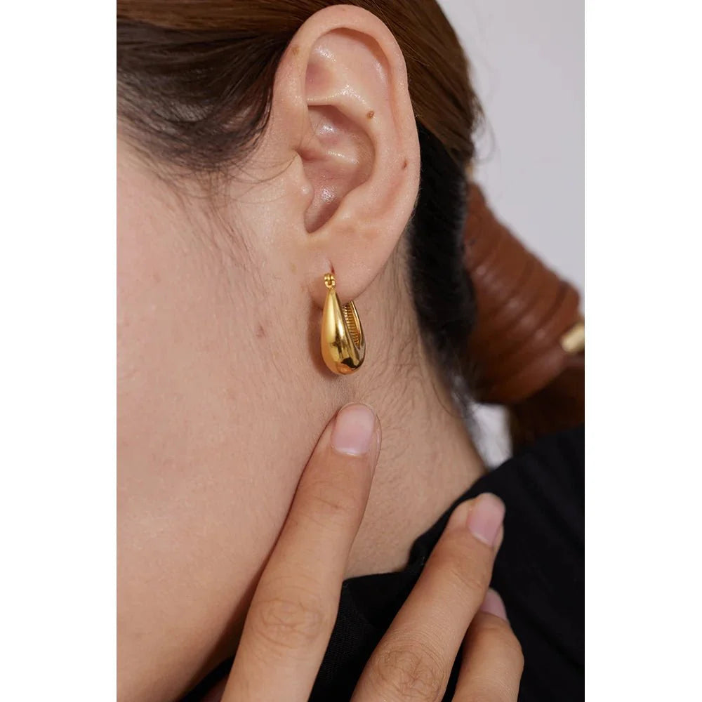 Turn heads and elevate any look with our Golden Tides Hoop Earrings. These stunning gold hoops blend sophistication with modern flair. featuring a bold. thick silhouette that tapers delicately for a refined edge. The ribbed texture on the inner curve adds a layer of intrigue to their smooth. polished finish. Designed for style and comfort. they're secured with a hinged clasp mechanism. making them the perfect accessory for everyday wear or special occasions.