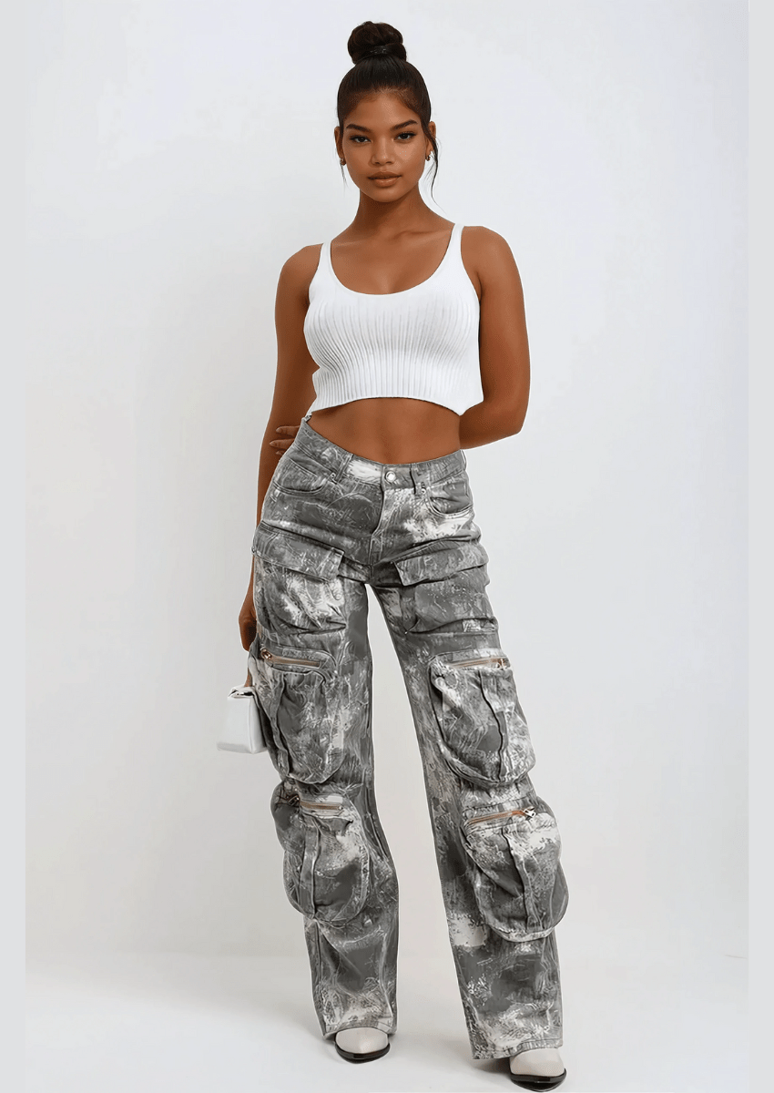 Effortlessly cool and undeniably practical. our Gray Tie Dye Cargo Pants are the perfect blend of fashion and function. Featuring a striking gray and white tie-dye pattern. these pants are designed for those who want to stand out while keeping it versatile. With multiple large zipper-closure pockets on the thighs. you'll have all the storage you need while rocking an edgy. modern look.