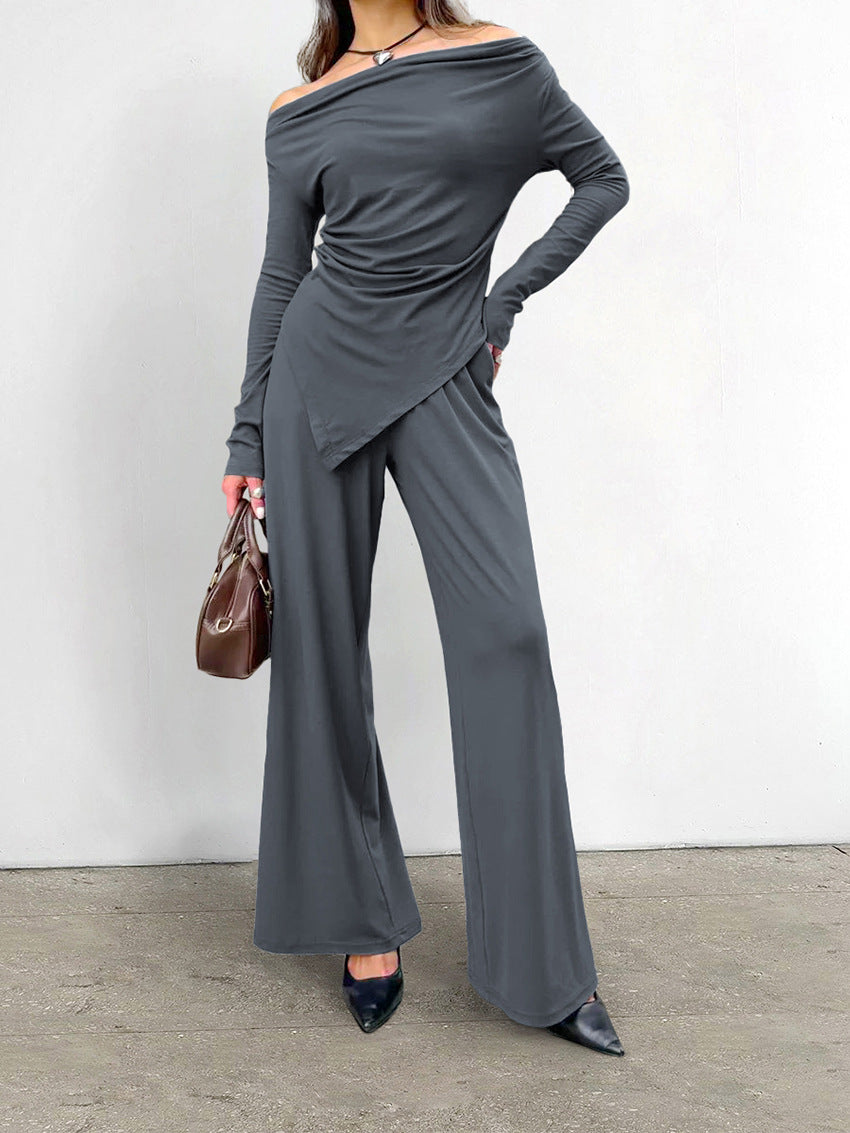 This Grey Knitting Fashion Off Shoulder Long Sleeve Top High Waist Wide Leg Pants Casual Two Piece Set Design Made Of High Quality Polyster And Spandex Material. It Is Stretchy, Durable And Comfortable. It Is a Must-Have Outfit For All Seasons. Wholesale Two Piece Pant Sets Can Solve Your Collocation Troubles.