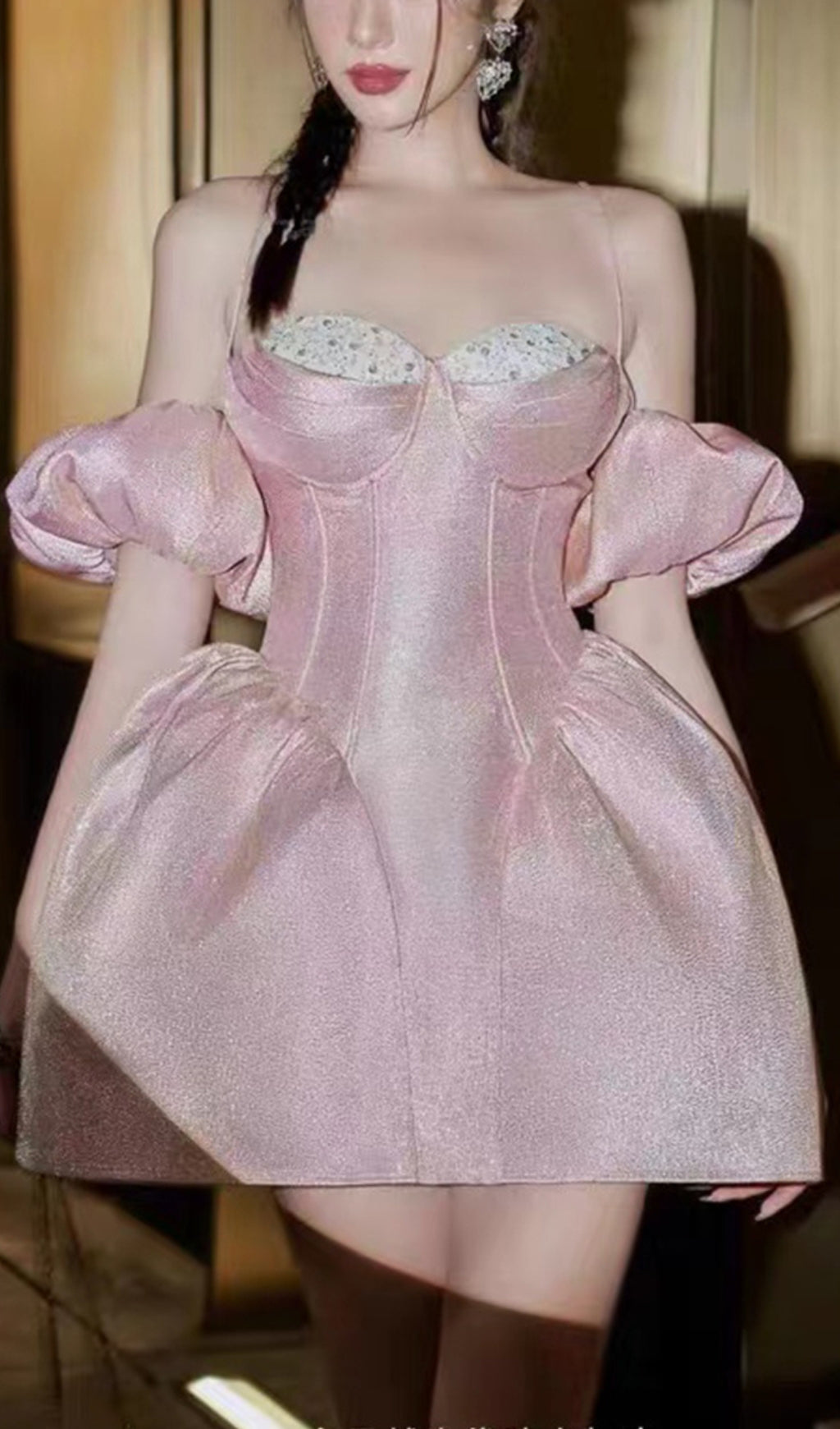 Adress fit for royalty with its sparkly. heavy bead-work and PUFFy pink sleeves! Feel like a true queen in this stunning show-stopper that will have everyone swooning. Perfect for a night out or a special occasion - time to get your princess on! 🤴👑