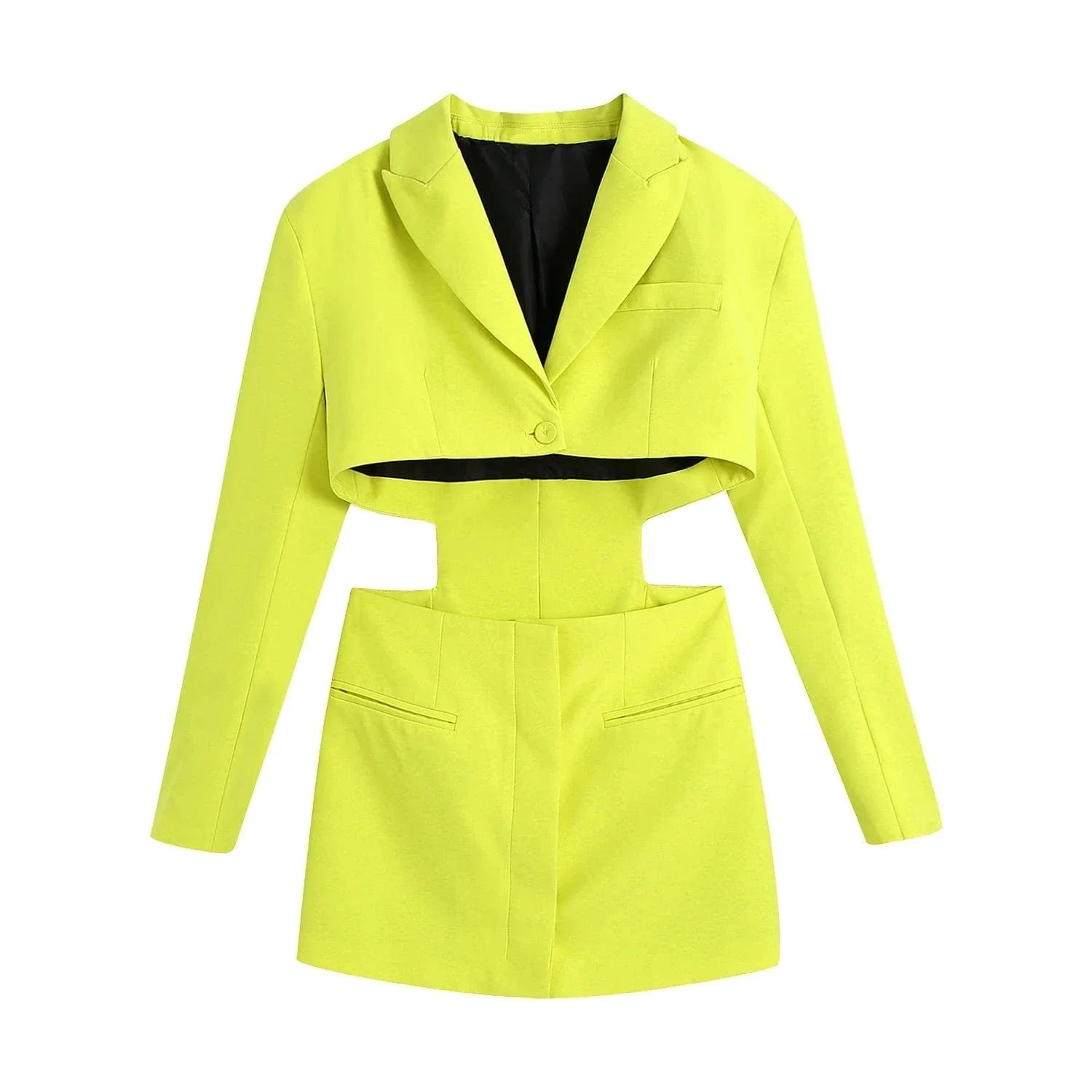 Introducing our Women's Hollow Out Waist Blazer Dress. a sophisticated blend of elegance and modern style. This unique dress features a hollow-out design at the waist. adding a trendy twist to the classic blazer silhouette. The structured fit and sleek lines create a flattering shape that accentuates your figure. making it a perfect choice for various occasions.