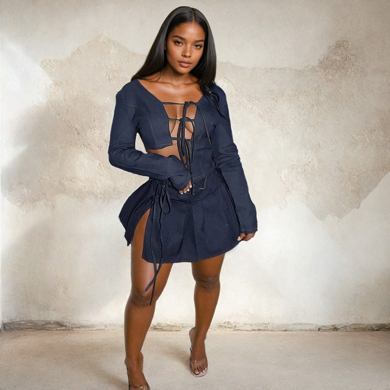 This combination includes an unevenly shaped. lace-up crop top that enhances your silhouette. The high slit on the pleated mini skirt adds charm while highlighting your legs. Ideal for a night out.