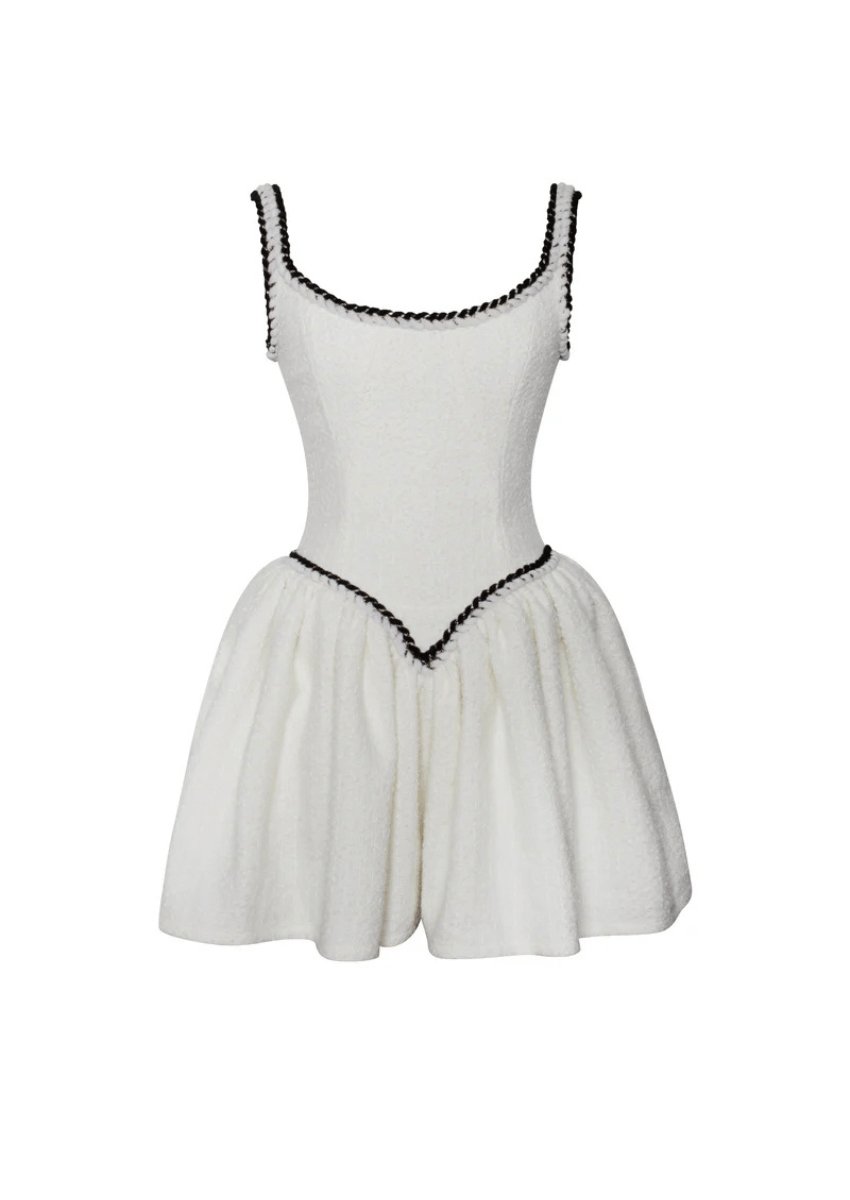 Embrace classic elegance with our Ivory Textured Mini Dress. a beautiful combination of refined style and playful silhouette. Crafted with a luxurious textured fabric. this dress features delicate black trim along the neckline. straps. and waistline for a striking contrast. The fitted bodice flares into a voluminous skirt. creating a flattering. hourglass silhouette. Perfect for daytime events or evening dinners. this dress effortlessly blends timeless charm with a modern twist.