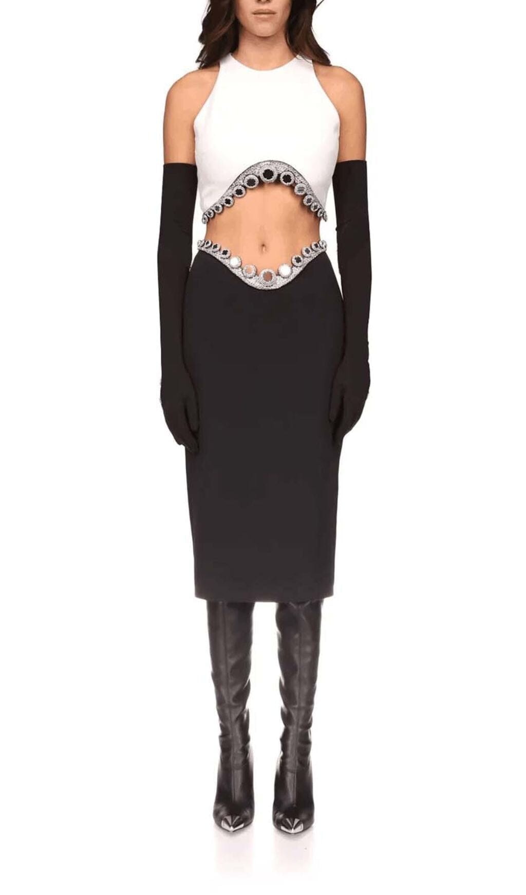 What could be more dazzling than this Jeweled Tentacle Two Piece? Be the talk of the town in this stylish swimsuit. The white jeweled tentacles will add some pizzazz to your beach look.