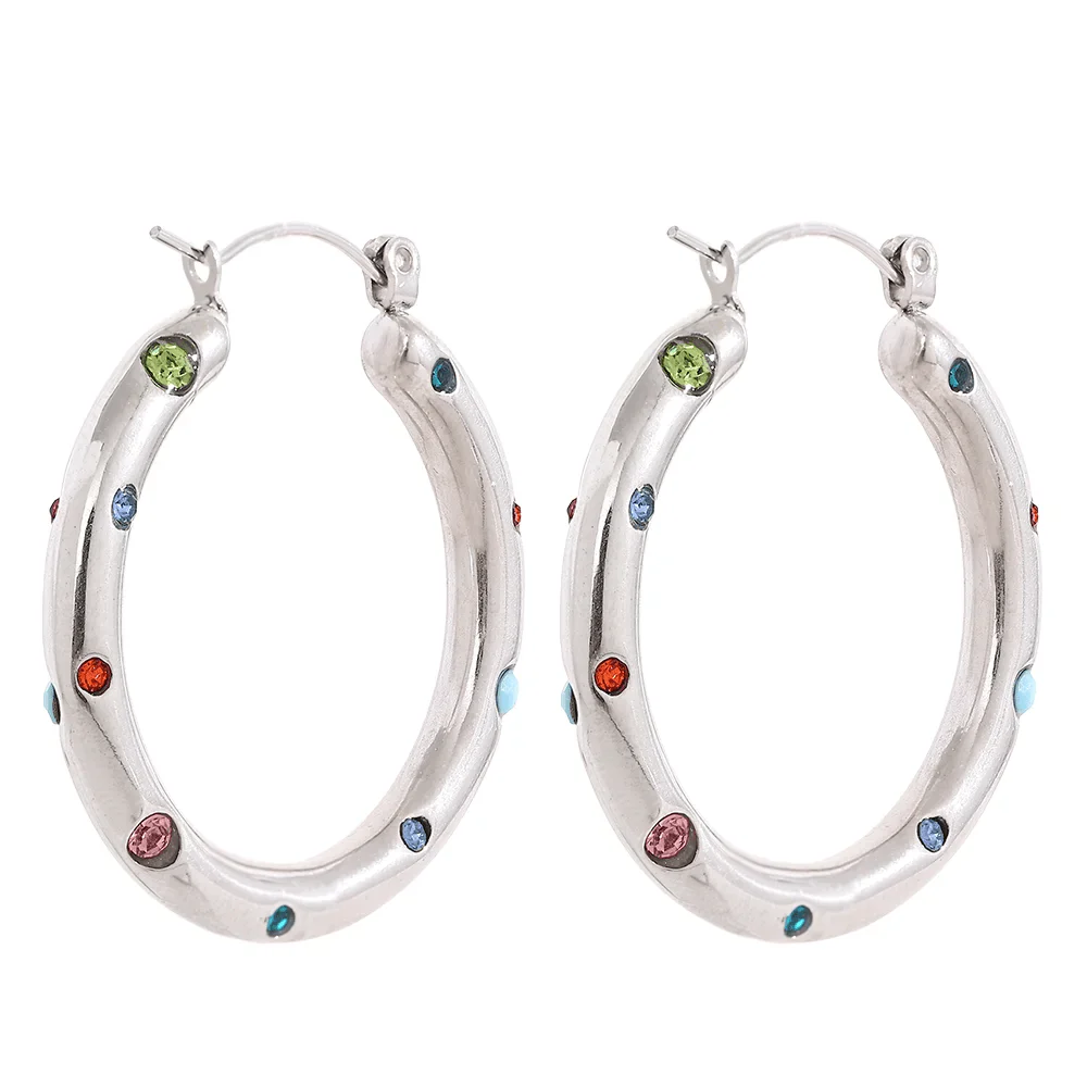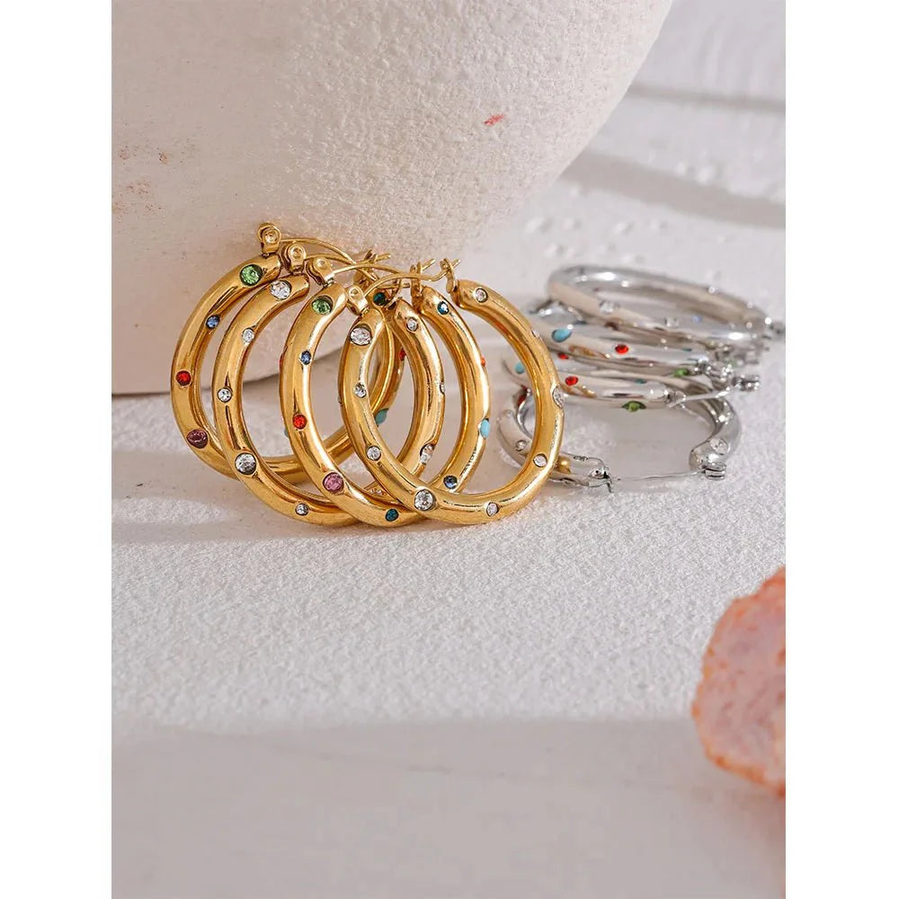 Add a touch of vintage charm and bohemian flair to your look with the Kaleidoscope Bliss Hoop Earrings. These stunning earrings seamlessly combine classic hoop shapes with vibrant gemstones. creating a timeless yet trendy accessory. Available in gold-colored hoops with a textured finish or silver-colored hoops. each pair is adorned with sparkling. multi-colored gemstones. making them the perfect statement piece for any occasion.