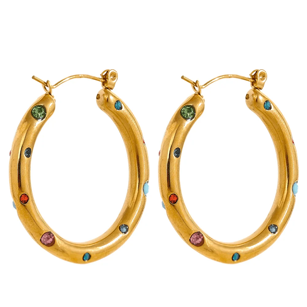 The Kaleidoscope Bliss Hoop Earrings are a captivating blend of vintage-inspired design and modern bohemian aesthetics. Perfect for those who love to embrace their individuality. these hoops bring personality to any ensemble. Crafted from stainless steel and plated with PVD real gold. they are lightweight. durable. and resistant to tarnish. ensuring they remain a cherished part of your jewelry collection.