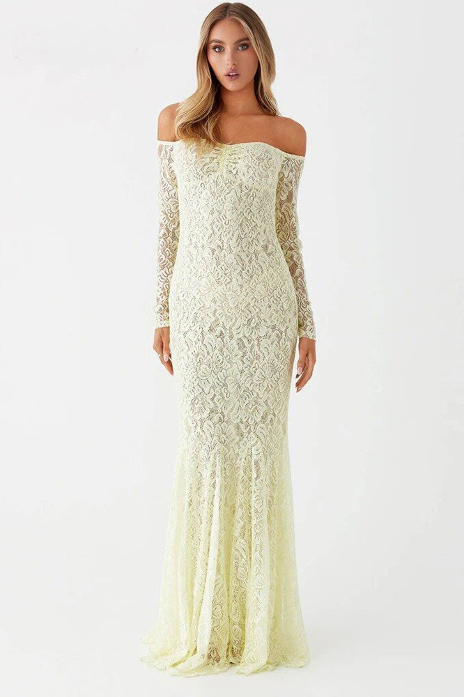 Radiate effortless charm in the Lace Off Shoulder Long Sleeve Wedding Dress. With its off-shoulder design, sweetheart neckline, and delicate floral lace material, this dress is your go-to for enchanting evenings and golden-hour moments.