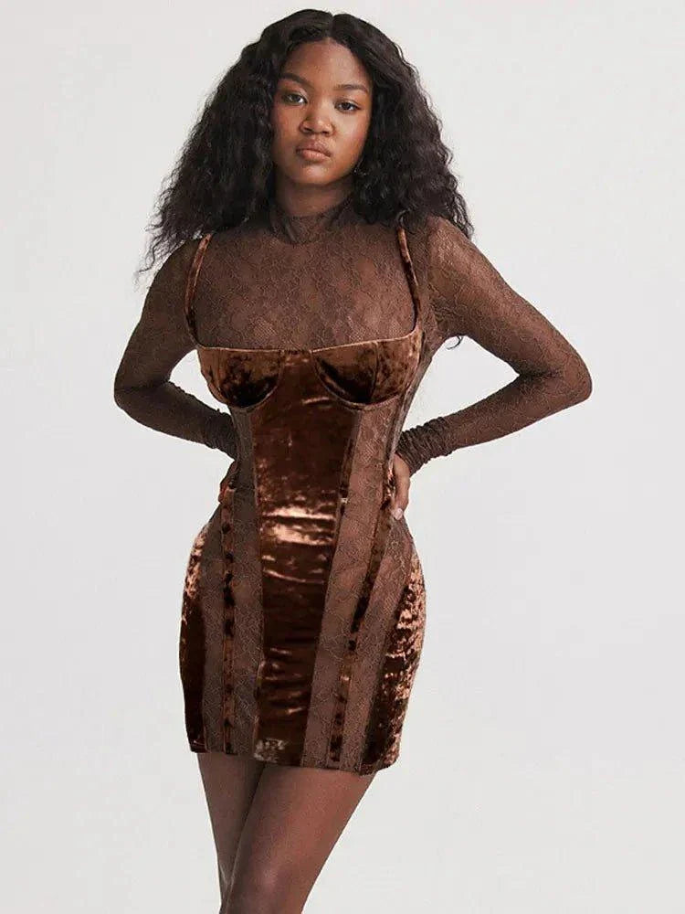 This stunning dress combines the soft elegance of lace with the rich texture of velvet for a look that's both comfortable and eye-catching. The flattering mini length shows off your legs. while the intricate lace details add a touch of femininity.