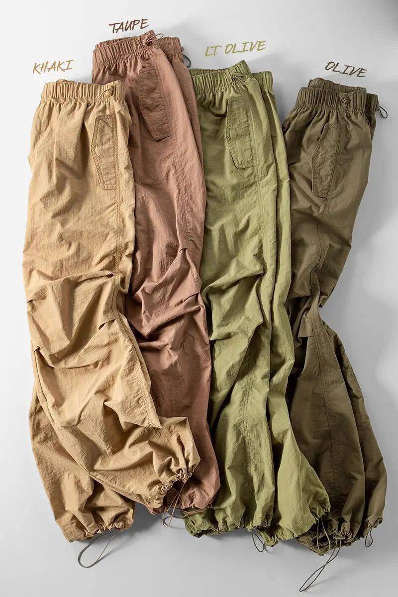 Stay on-trend with the Loose Fit Parachute Pants in Olive. offering a relaxed. comfortable fit perfect for casual wear. Made with lightweight fabric. these pants feature an adjustable waistband and cuffs for a customizable look and fit.