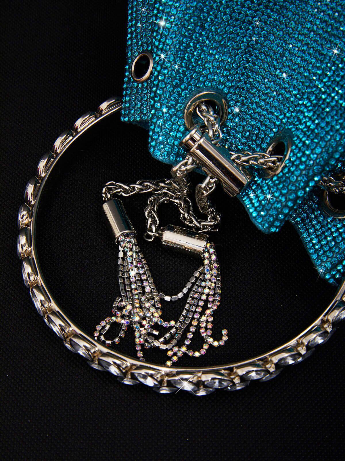 Our signature Crystal Embellished BucketBag In Blue is crafted from hot pink crystal. A statement accessory to love forever. it is finished with a sparkling crystal top handle and a sleek drawstring chain that cinches the supple shape. Take yours with you everywhere.