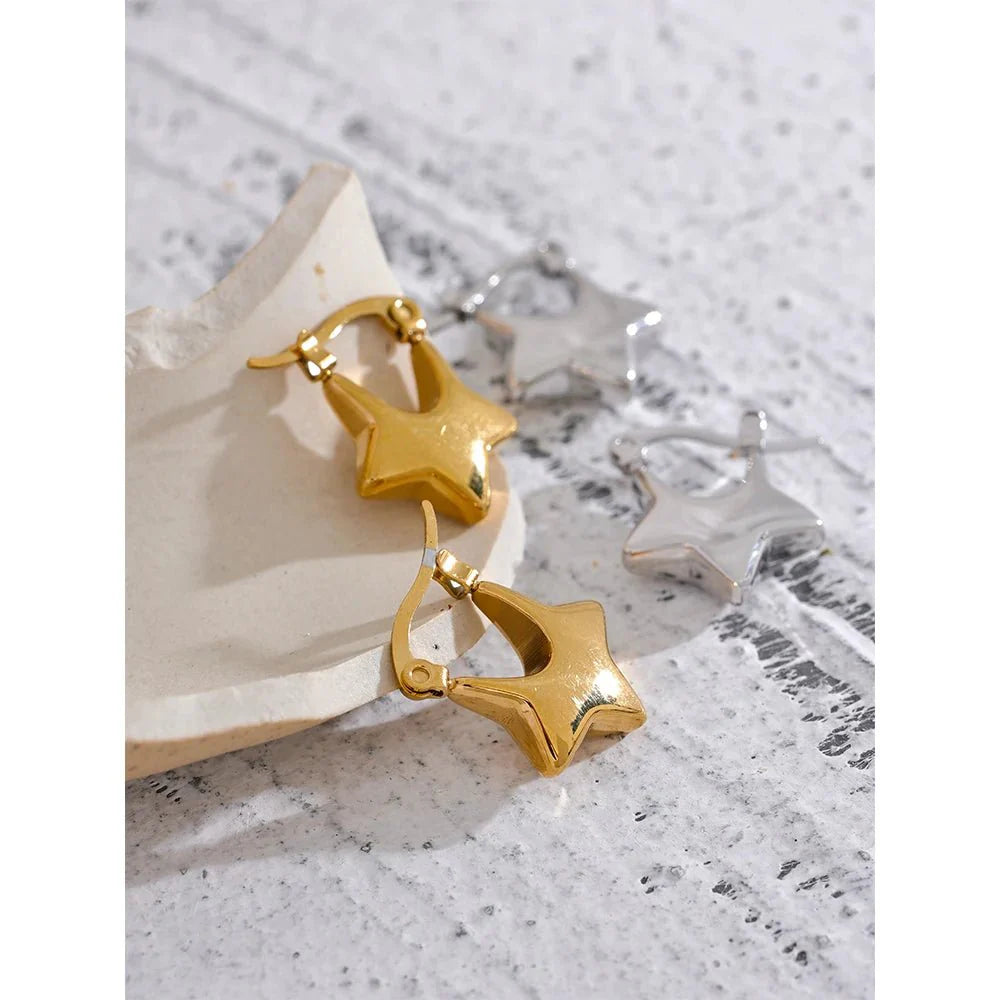 Transform your everyday look with a touch of stardust! The Nebula Gleam Hoop Earrings feature a dazzling star-shaped design that captures the beauty and mystery of the night sky. Perfectly crafted to symbolize guidance. hope. and wonder. these earrings are available in gold and silver finishes to suit every style. Whether you're dressing up for a party or adding a bit of sparkle to your casual outfit. these earrings are sure to turn heads.