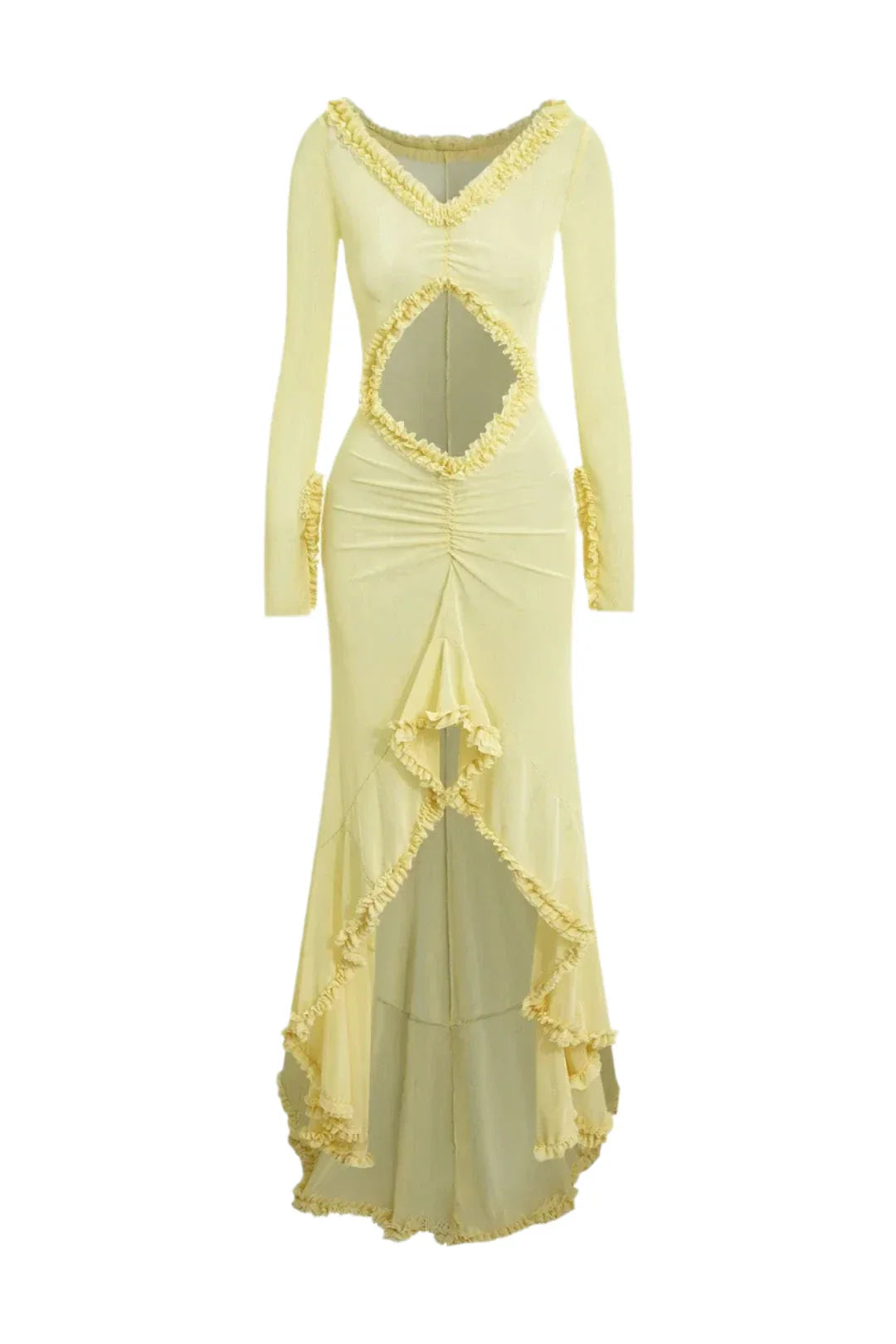 The dress's unique open-stomach design allows for a breezy feel. perfect for warm summer evenings. The ruched detailing on the low back not only adds a touch of sophistication but also provides a flattering fit for all body types.