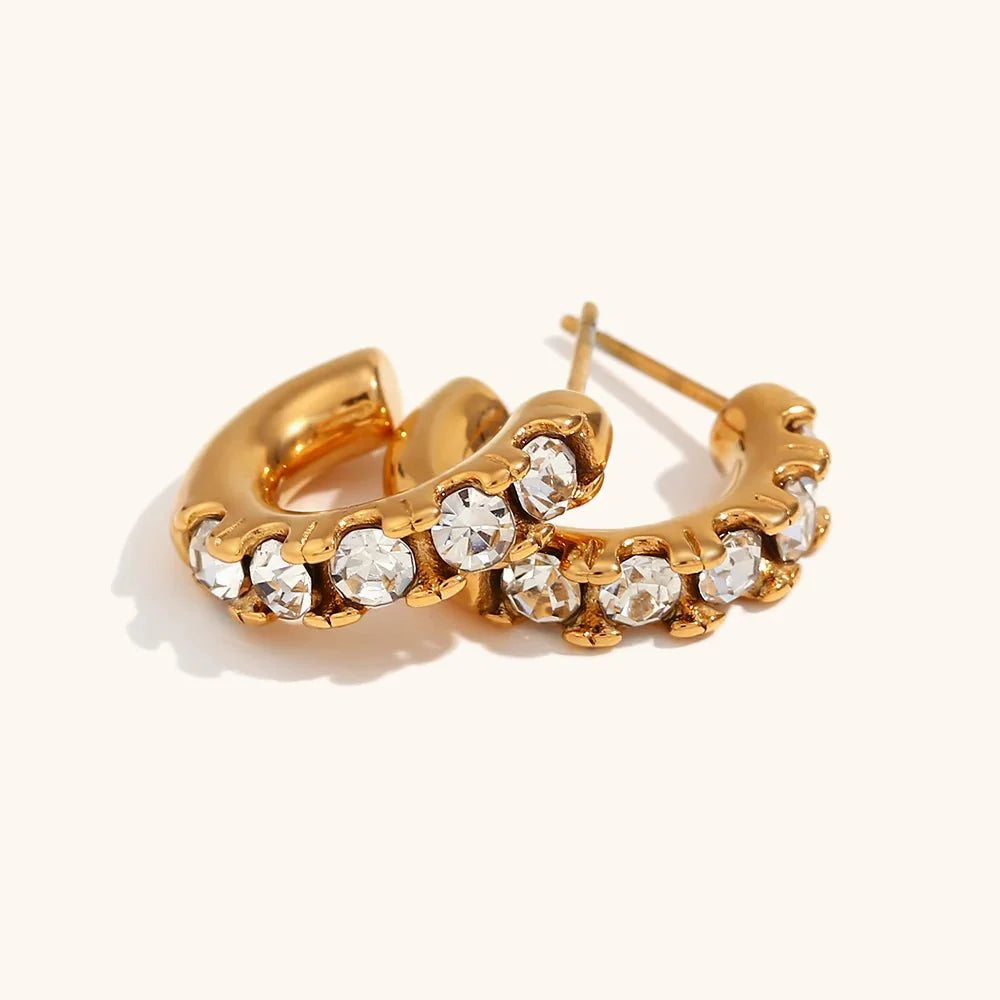 Elevate your jewelry collection with these Our Fave Gold Small Hoop Earrings! Adorned with five clear. round-cut gemstones along the outer edge. these earrings bring effortless elegance and a refined sparkle to any outfit. Perfect for everyday wear or special occasions. these versatile huggies are designed to dazzle while staying comfortable all day long.