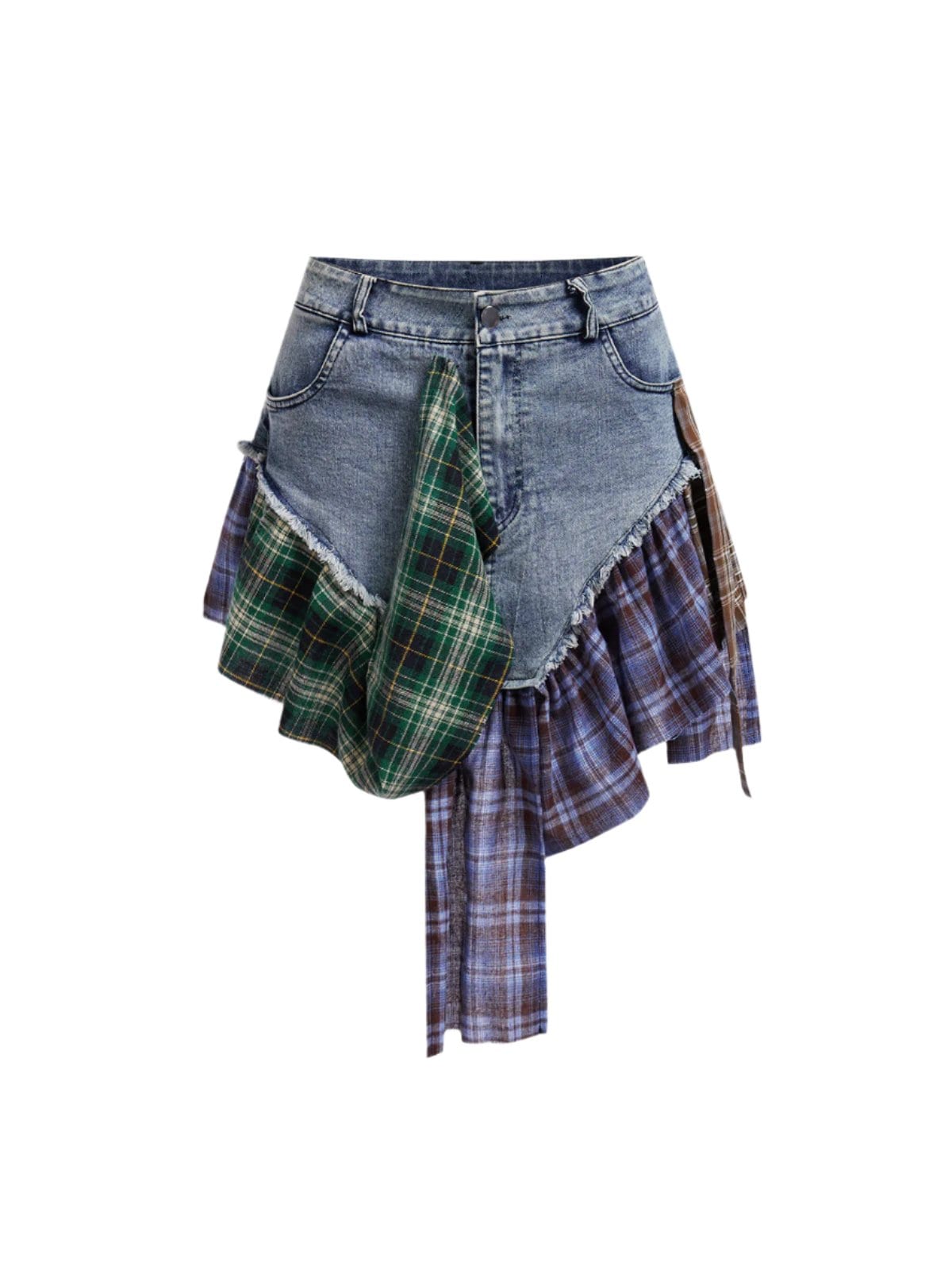 A trendy and stylish look with its unique combination of classic plaid pattern and denim material. Its versatile design allows for easy pairing with any clothing top.