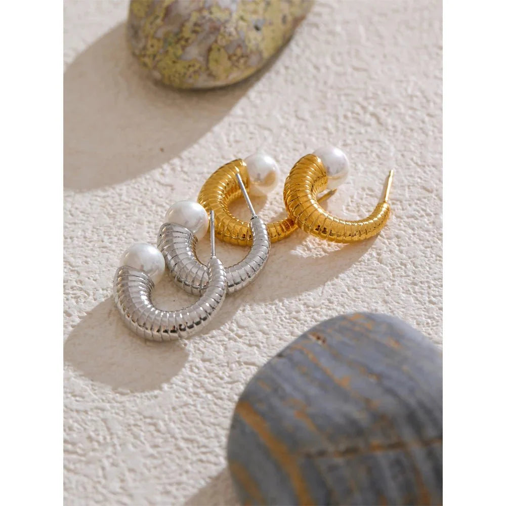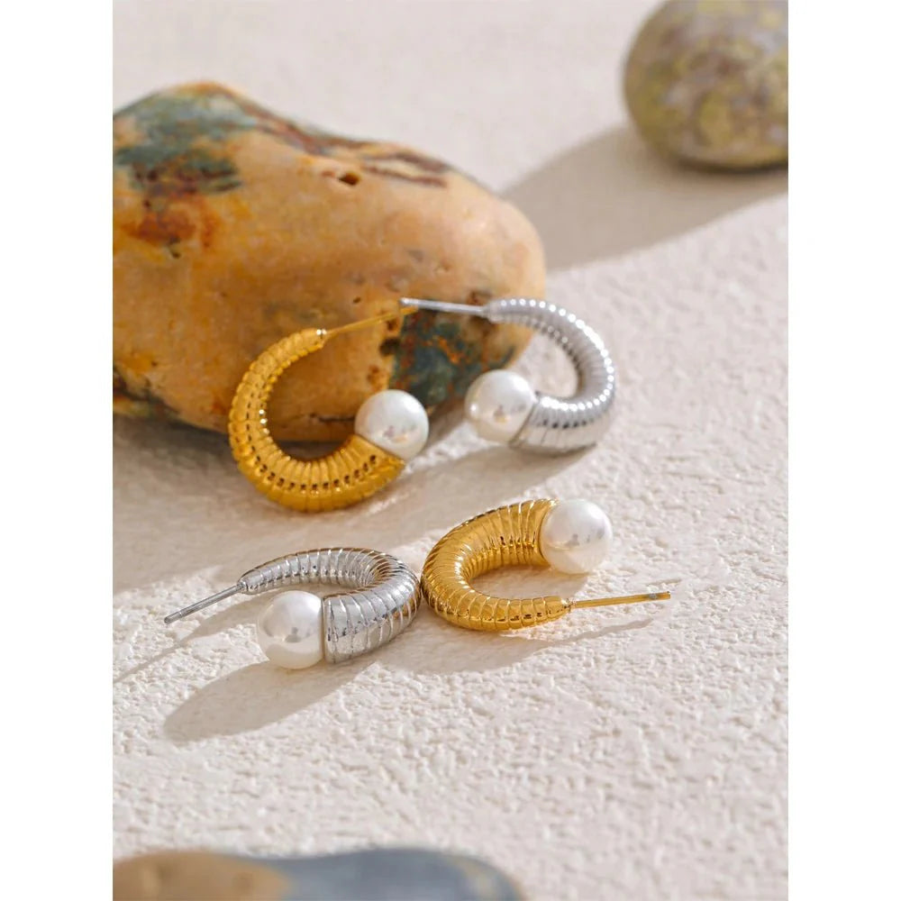 Introducing the Pearl Ribbed Small Hoop Earringsa perfect blend of classic sophistication and modern design. Featuring a ribbed. coiled design in sleek stainless steel with a lustrous pearl accent. these earrings are available in two stunning finishes: gold and silver. They're versatile. lightweight. and effortlessly chic. making them an essential addition to your jewelry collection.