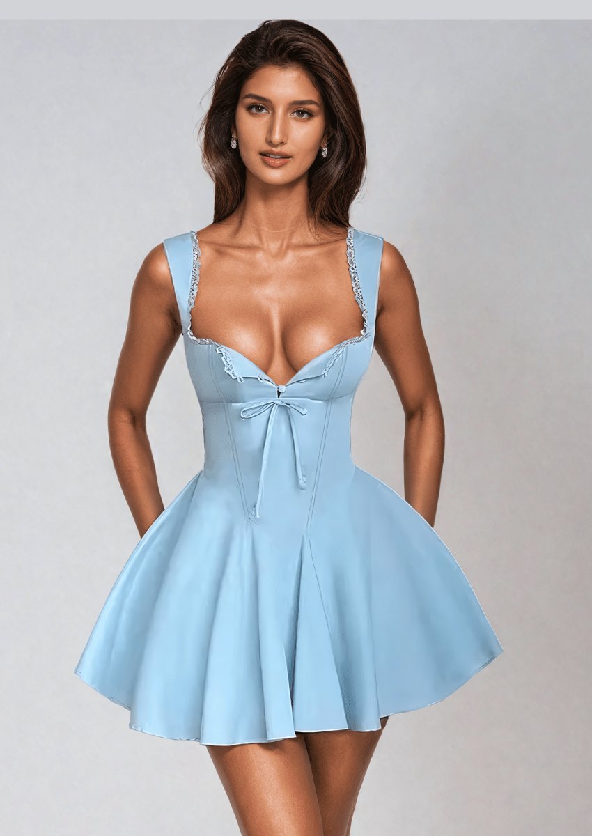 This powder blue fit-and-flare mini dress is the epitome of elegance and charm. With delicate lace trim along the neckline. a sweetheart cut with a dainty bow detail. and a flattering flared skirt. this dress is designed to make you feel effortlessly beautiful. The soft color and structured bodice create a perfect combination of sweetness and sophistication. ideal for garden parties. brunch. or special occasions.