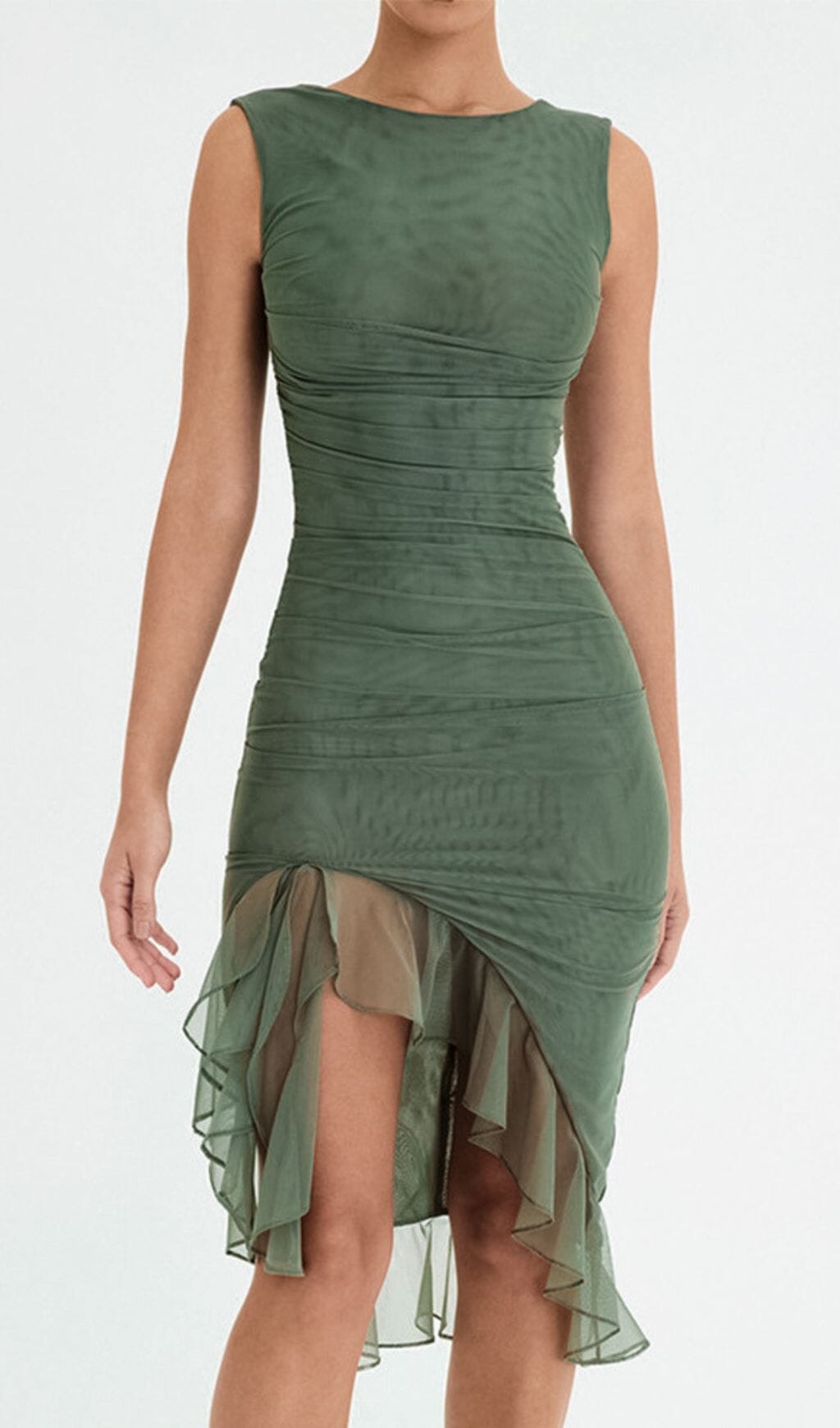 Our Ruched Irregular Dress in Green is a must-have for any daring fashionista. The corset-inspired waist and irregular hemline add an edgy twist to this sophisticated piece. making it perfect for any occasion.