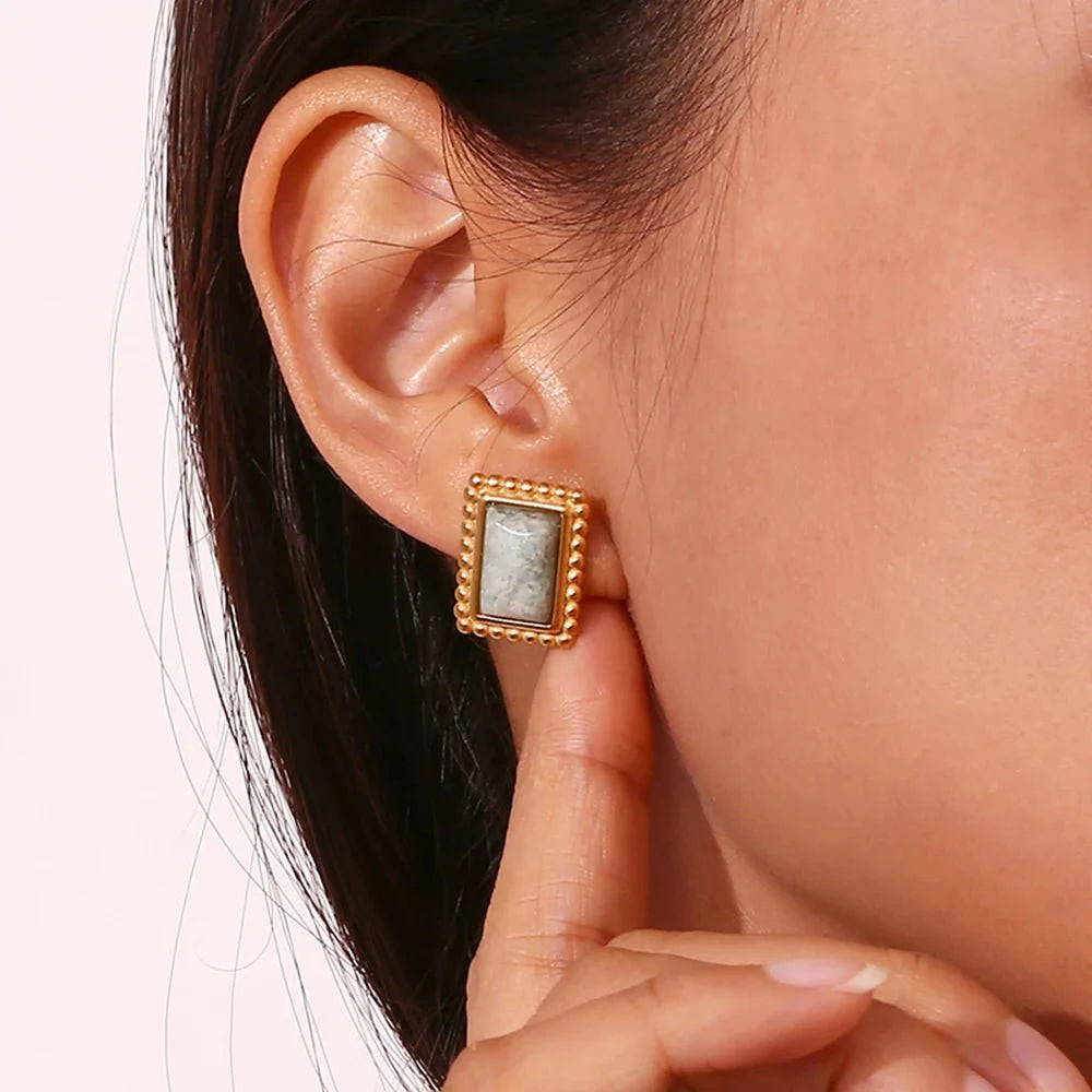 Perfect for Any Occasion: Discover the stunning Rectangular Stone Frame Earrings. a blend of modern sophistication and timeless elegance. Featuring navy blue. blue. and gray marbled stones. these earrings are framed with gold and silver stainless steel adorned with intricate beaded detailing. Whether you're dressing up for an evening out or adding a stylish touch to your everyday outfit. these earrings are the perfect accessory to make a statement.
