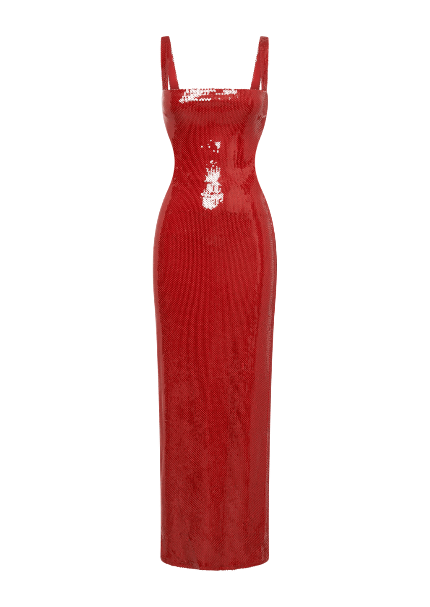 Turn heads and make a bold statement with the Red Maxi Dress. a show-stopping evening gown that oozes glamour and sophistication. This stunning floor-length dress is adorned with shimmering sequins and features a chic side cutout for a touch of modern allure. Whether you're walking into a gala. a formal dinner. or a romantic evening event. this dazzling dress ensures you'll shine all night long.