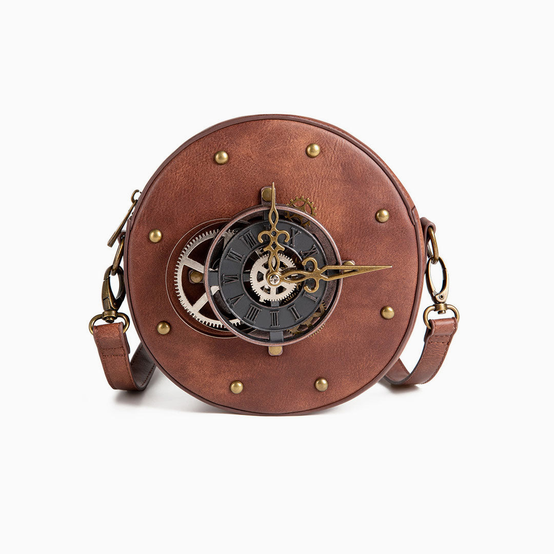 Give your style an on-trend edge with this crossbody bag. Made from faux leather material. embellished with a clock front with studs. featuring a round shape with zip-round closure. adjustable and detachable shoulder strap. lined interior with a card slot and a zippered pocket. an exterior card slot to the back for a practical finishing touch. Find more unique women's crossbody bags or chic bags in our boutique. and finish your vintage look with our trendy accessories.