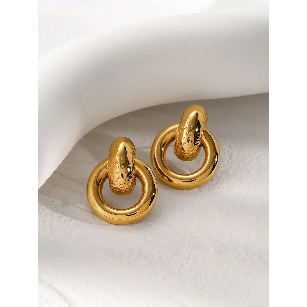 Upgrade your jewelry collection with these Round Knot Stud Earrings a perfect blend of modern elegance and timeless style. Featuring a unique dual-loop design. these earrings combine a smooth gold hoop with a textured. hammered oval loop. creating a striking contrast that adds depth and sophistication to any outfit. Whether you're dressing up for a night out or adding a chic touch to your everyday look. these earrings are a must-have accessory.
