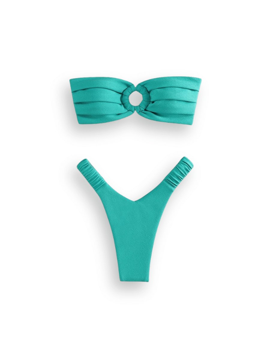The bandeau top adds a playful yet sophisticated touch. while the low-rise bottoms highlight your waist and hips beautifully.