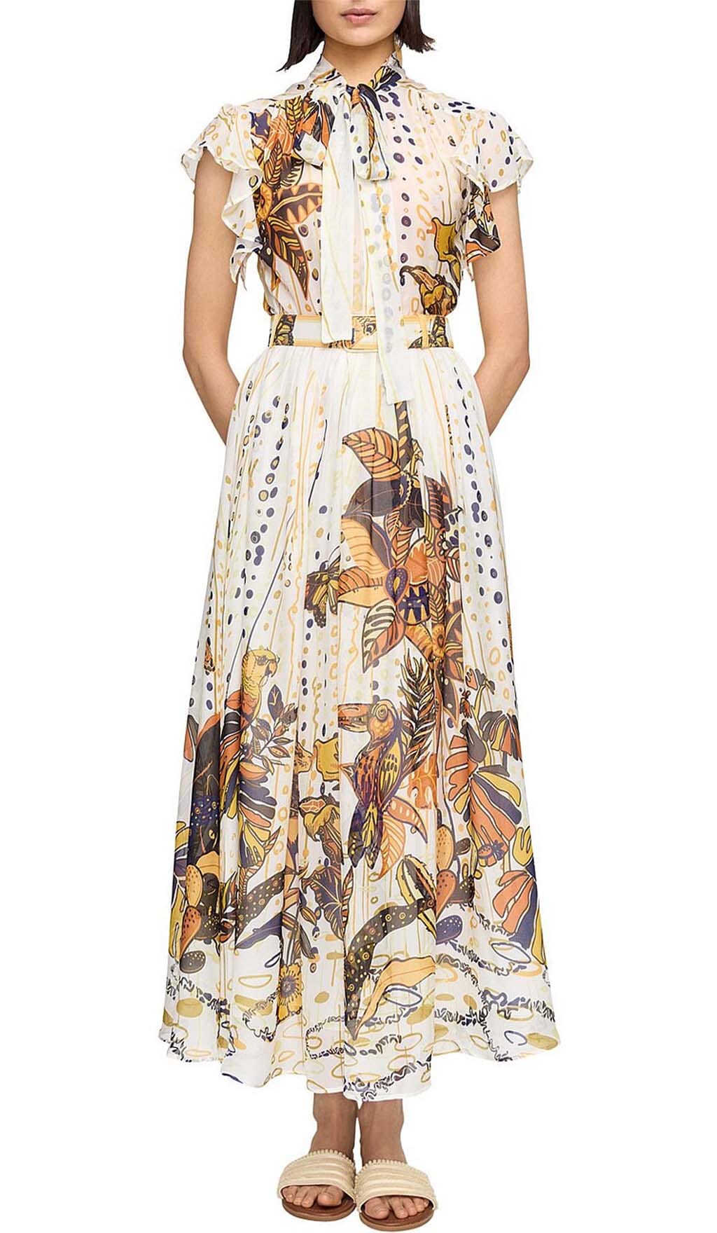 Sweetly feminine. this relaxed maxi sundress delights with rows of ruffles trimming the shoulders and cascading down the sleeves. The floaty skirt sways around you while the elasticized waist defines your silhouette. A warm weather must-have for breezy summer days.