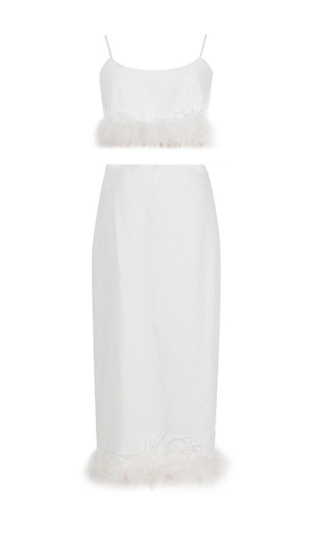Spaghetti Feather Trimmed Skirt Set is the perfect choice for a professional yet fashionable ensemble. This midi skirt set boasts spaghetti straps. feather trim and a split design for shape and definition. Enjoy the comfort of the lightweight fabric with added pizzazz.