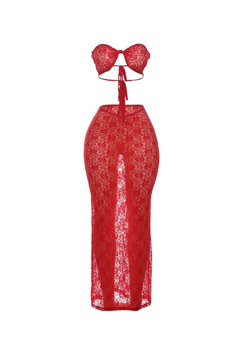 Introducing the Sexy See-Through 2-Piece Set from Krzno. This alluring set features a bandage bra and a matching long skirt. both designed to make a bold statement. Perfect for clubwear. parties. or any occasion where you want to stand out. this set combines sensuality with style.