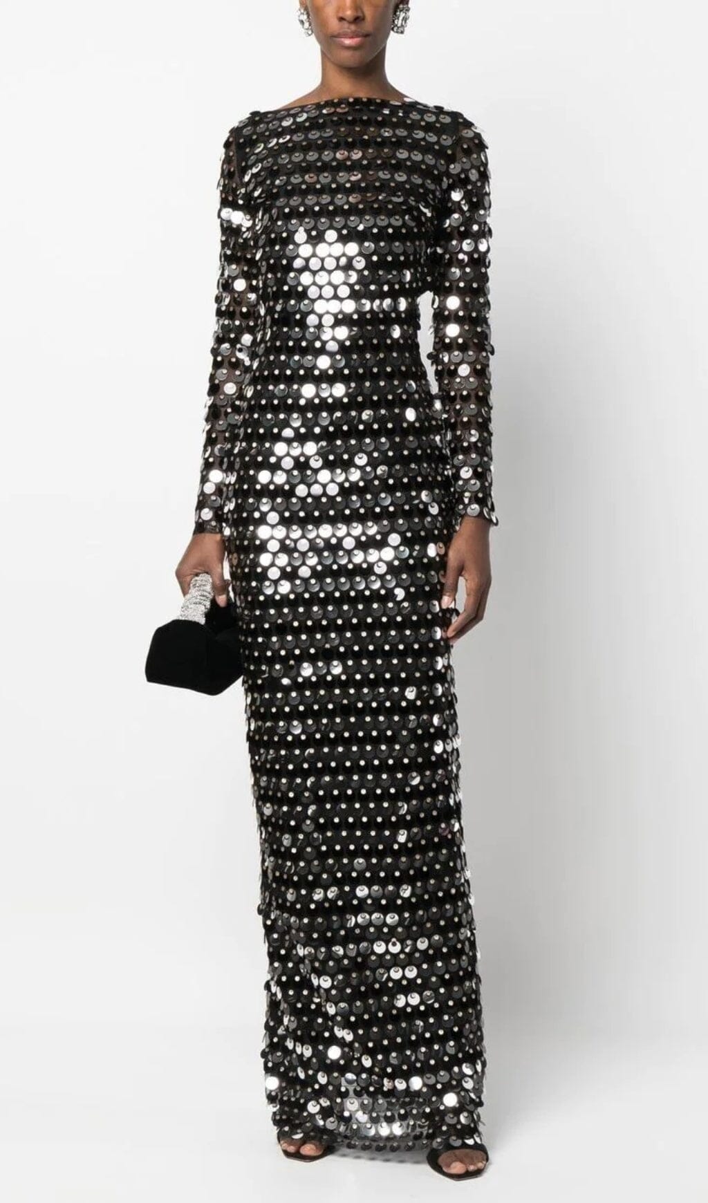 Made with high-quality sequin material. this dress is designed to shimmer and shine from every angle. The long sleeves add a touch of sophistication while the maxi length creates a dramatic and elegant silhouette.
