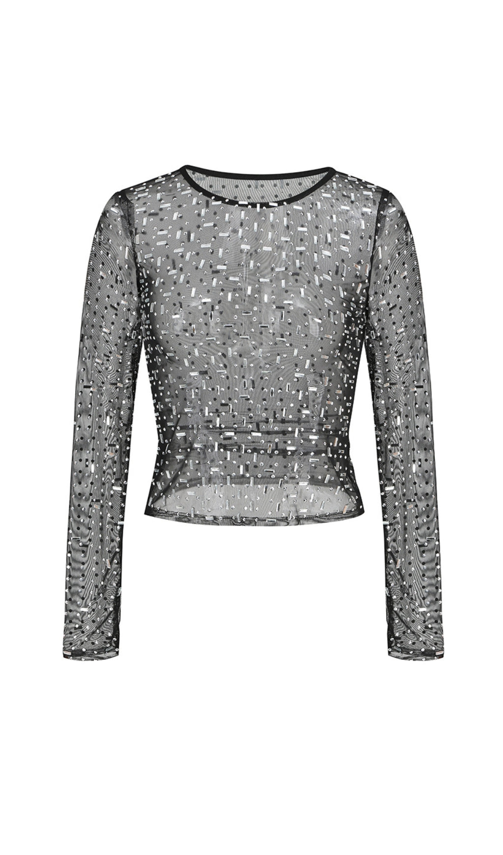 Sparkle in style with this black sequin rhinestone mesh top! Perfect for any night out.