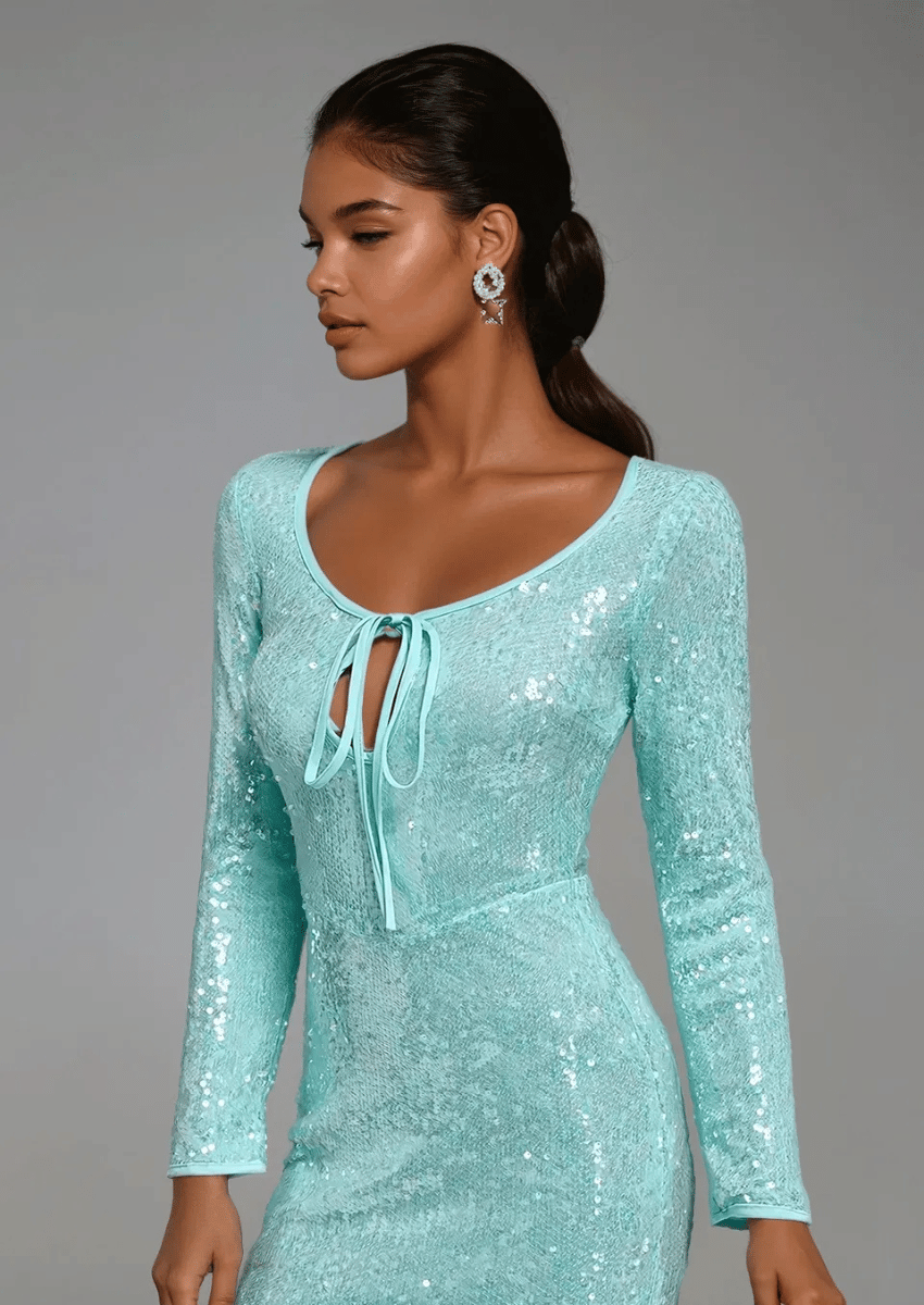 Turn every head in the room with the Sequin Tie-Front Gown. a stunning floor-length dress that exudes luxury and sophistication. With its sparkling sequin finish. daring tie-front neckline. and figure-hugging silhouette. this gown is the ultimate choice for special occasions where you want to shine.