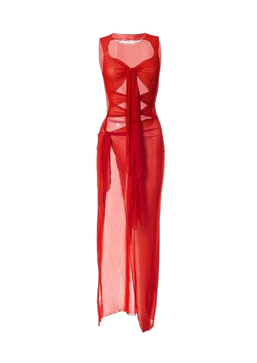 This Sheer Mesh Maxi Dress features a lower and side string tie. allowing for a customizable fit. It has lightweight. sheer fabric and is perfect for special occasions or a night out on the town.